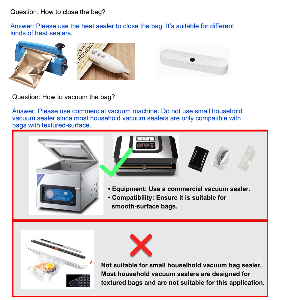 Requirement of Vacuum Machine:Please use commercial vacuum machine. Do not use small household vacuum sealer since most household vacuum sealers are only compatible with bags with textured-surface.